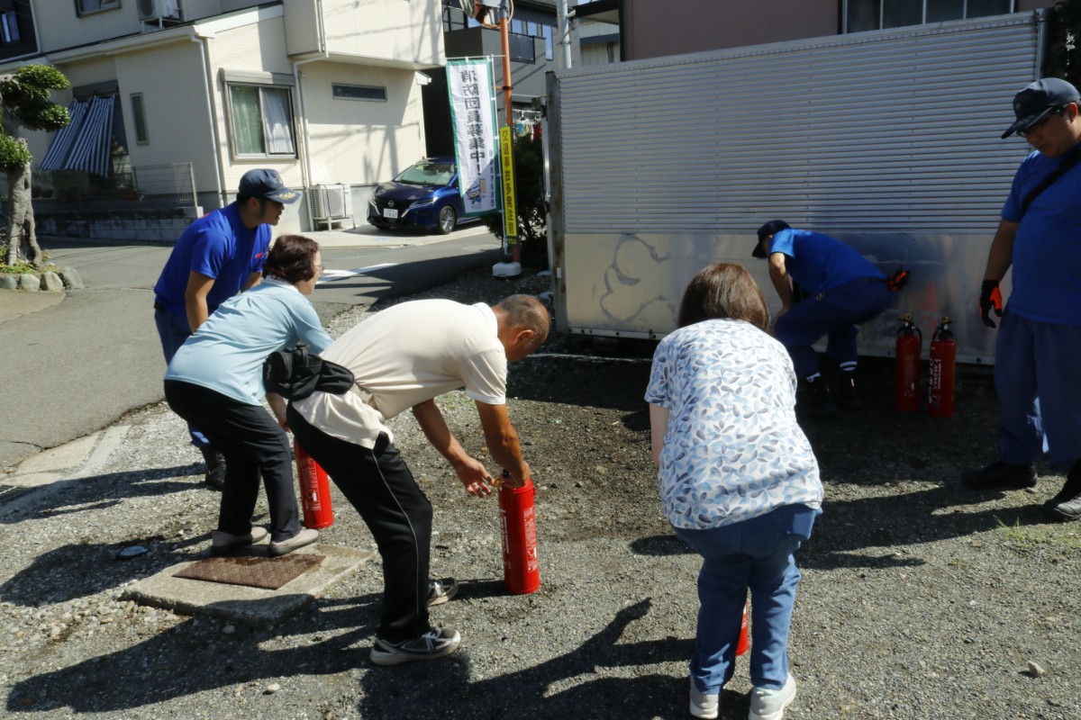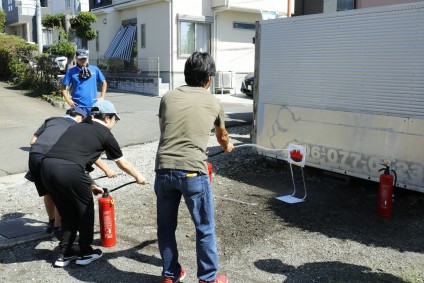 水消火器を使っての初期消火訓練