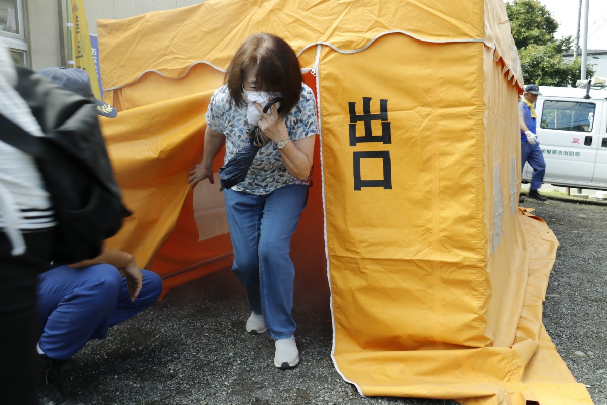 煙体験ハウスの煙の中を出てきた訓練参加者➁