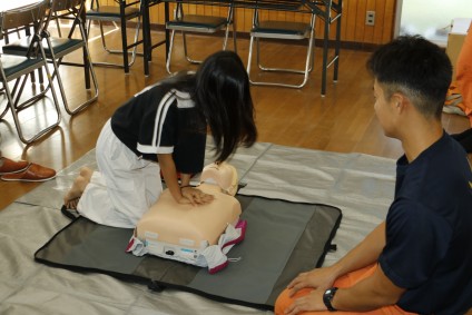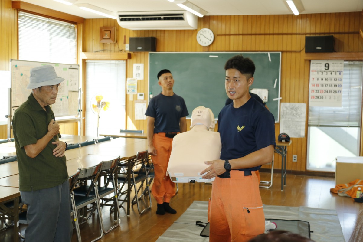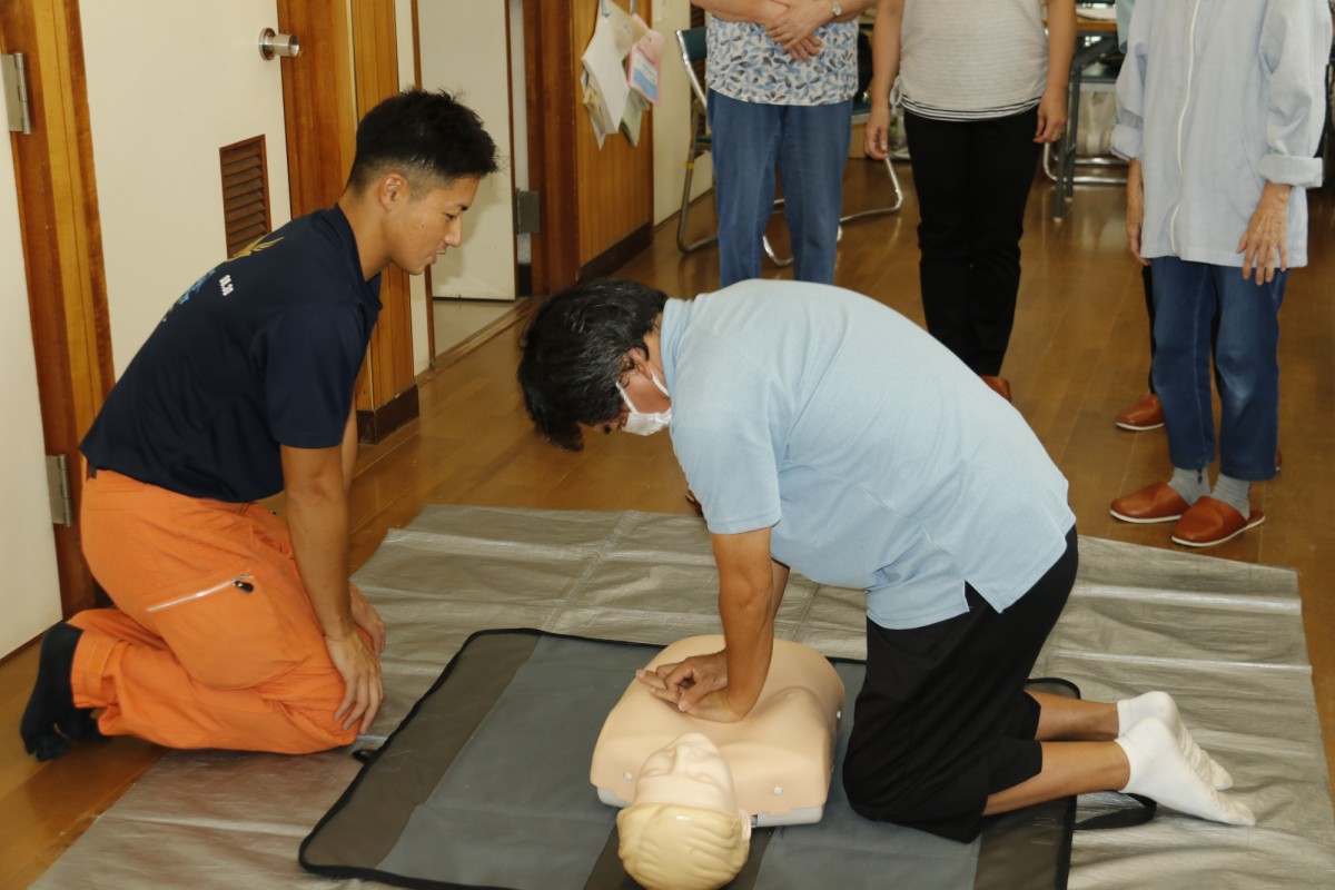 心肺蘇生訓練で胸骨圧迫(心臓マッサージ)のデモンストレーションを行う田名分署職員