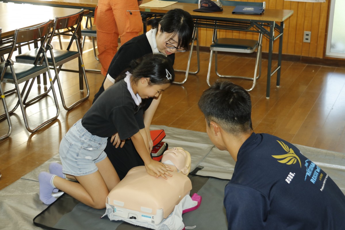 人形を使い胸骨を圧迫(心臓マッサージ)して心肺蘇生訓練を行う小学生の訓練参加者