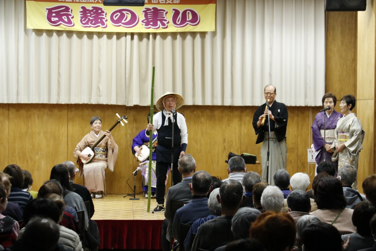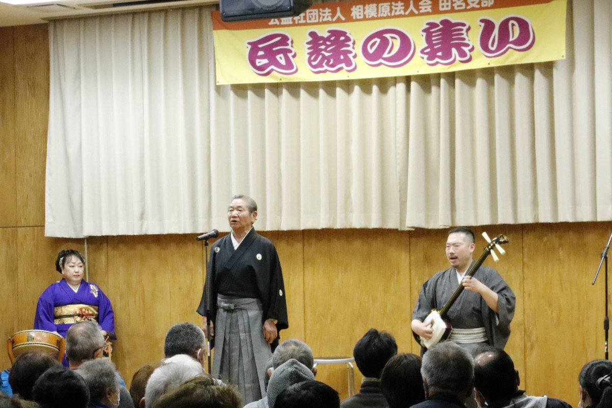令和8年1月18日(日)午後2時から公民館大会議室において、公益社団法人相模原法人会田名支部主催、田名地区自治会連合会後援「第9回 民謡の集い」が開催されました。このイベントには、地元の民謡愛好家(相模原市民謡協会所属)の「こだま会」「若松会」「友愛会」の皆さんが出演され二部構成で開催されました。一部、二部の間では地元の「踊和会」の皆さんが踊りを披露されました。民謡三団体は、全国で開かれる民謡コンクールにも出場され優勝するなど輝かしい成績を収めている方々で、「南部茅部鱈釣り口説き節」「津軽じょんがら節」など一節一声で歌い、会場からは大きな拍手で盛り上がりました。