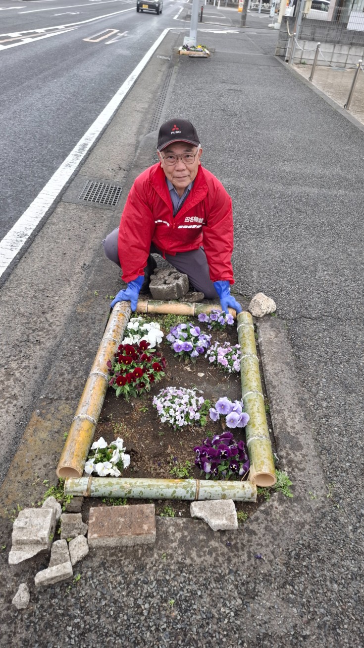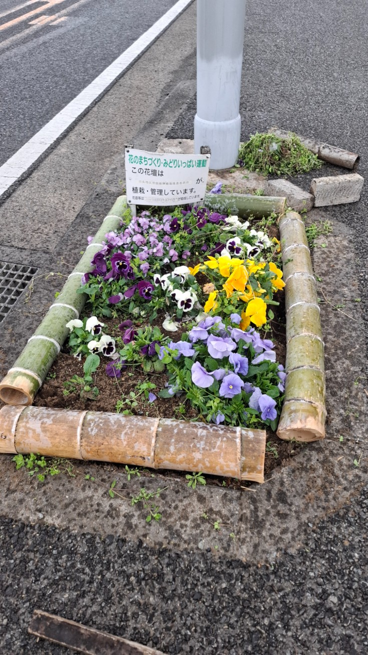 昨日(3月28日)午後、県道54号線 田名四ッ谷セブンイレブン~ブンブン 小麦の郷間にある植栽マス8箇所の周りに竹を設置してきました。