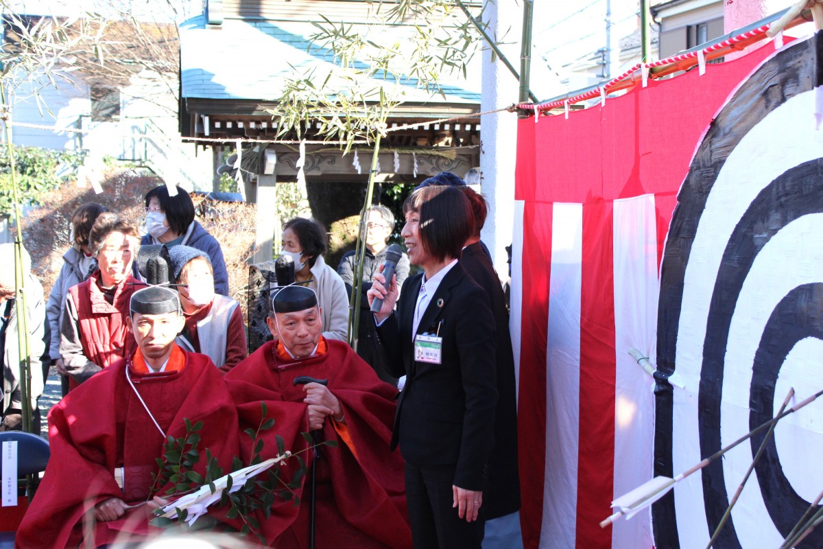 開式の挨拶に続き、的祭の由来を説明する大谷田名八幡宮総代長。