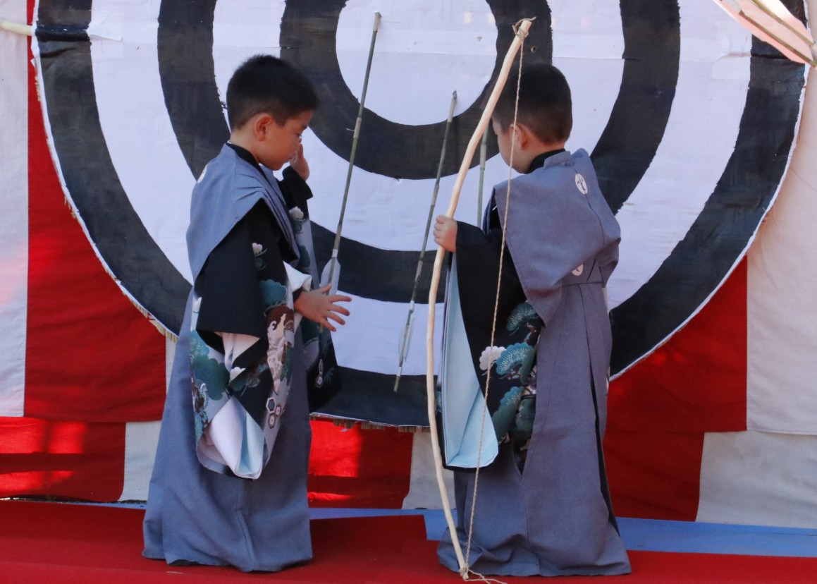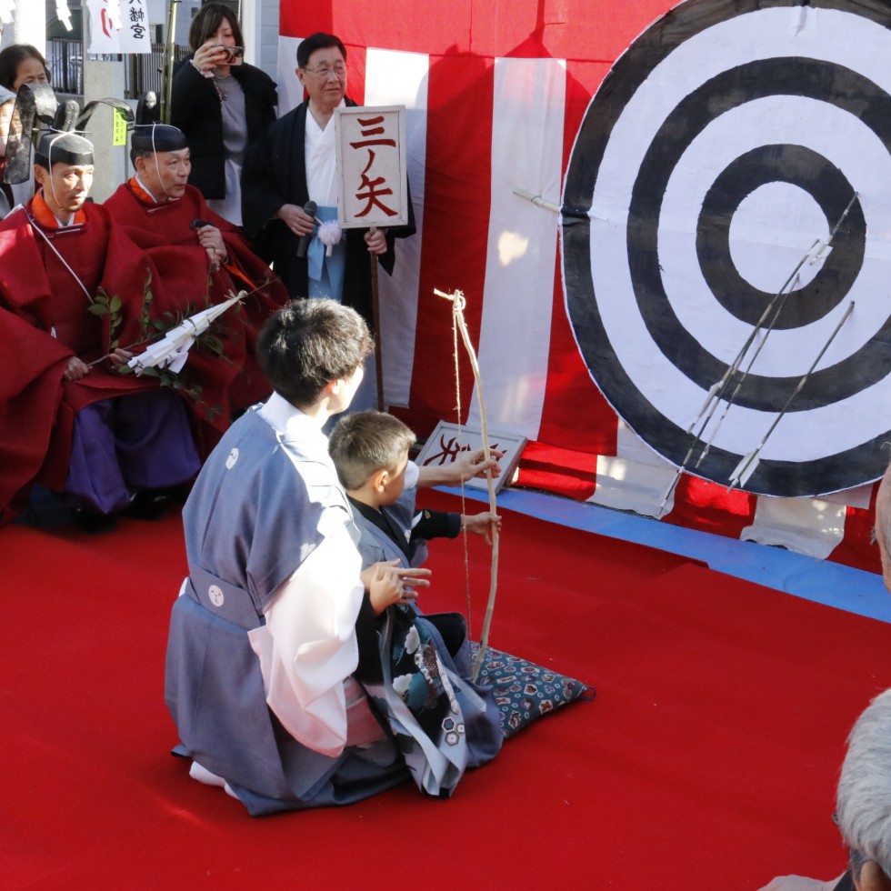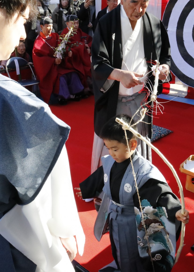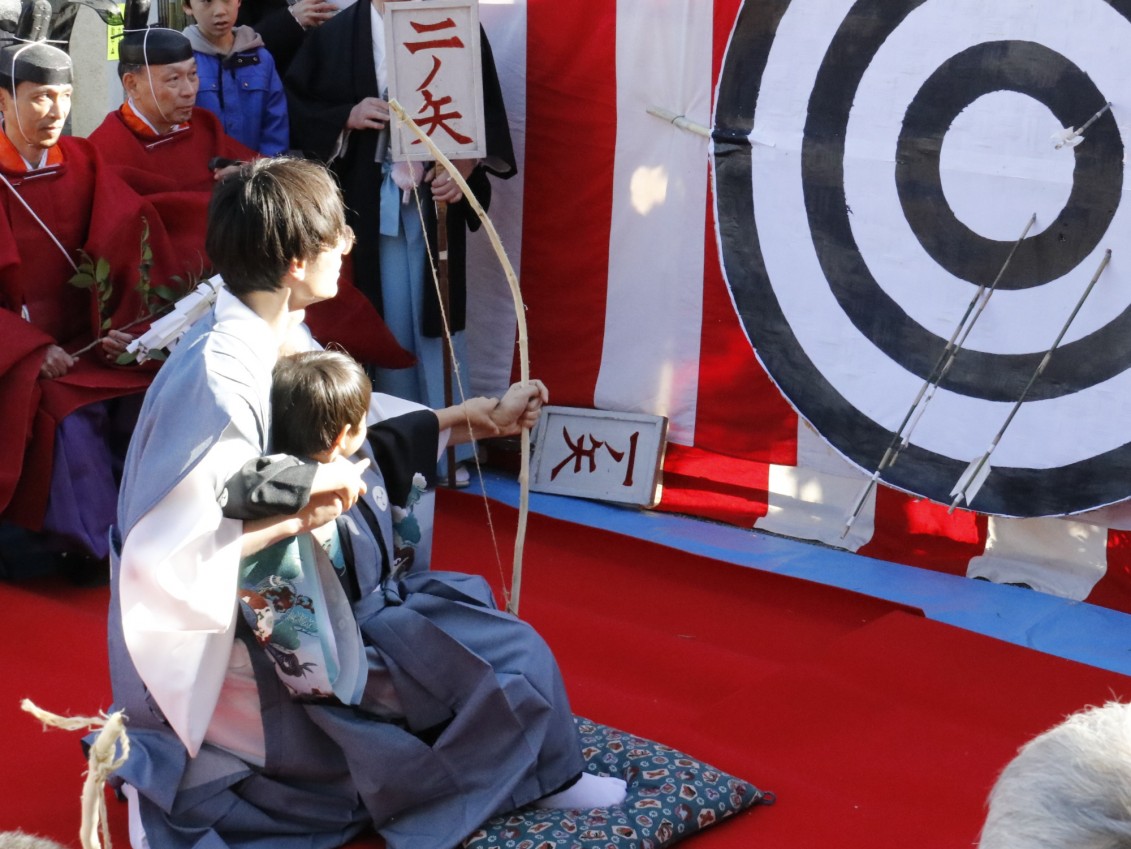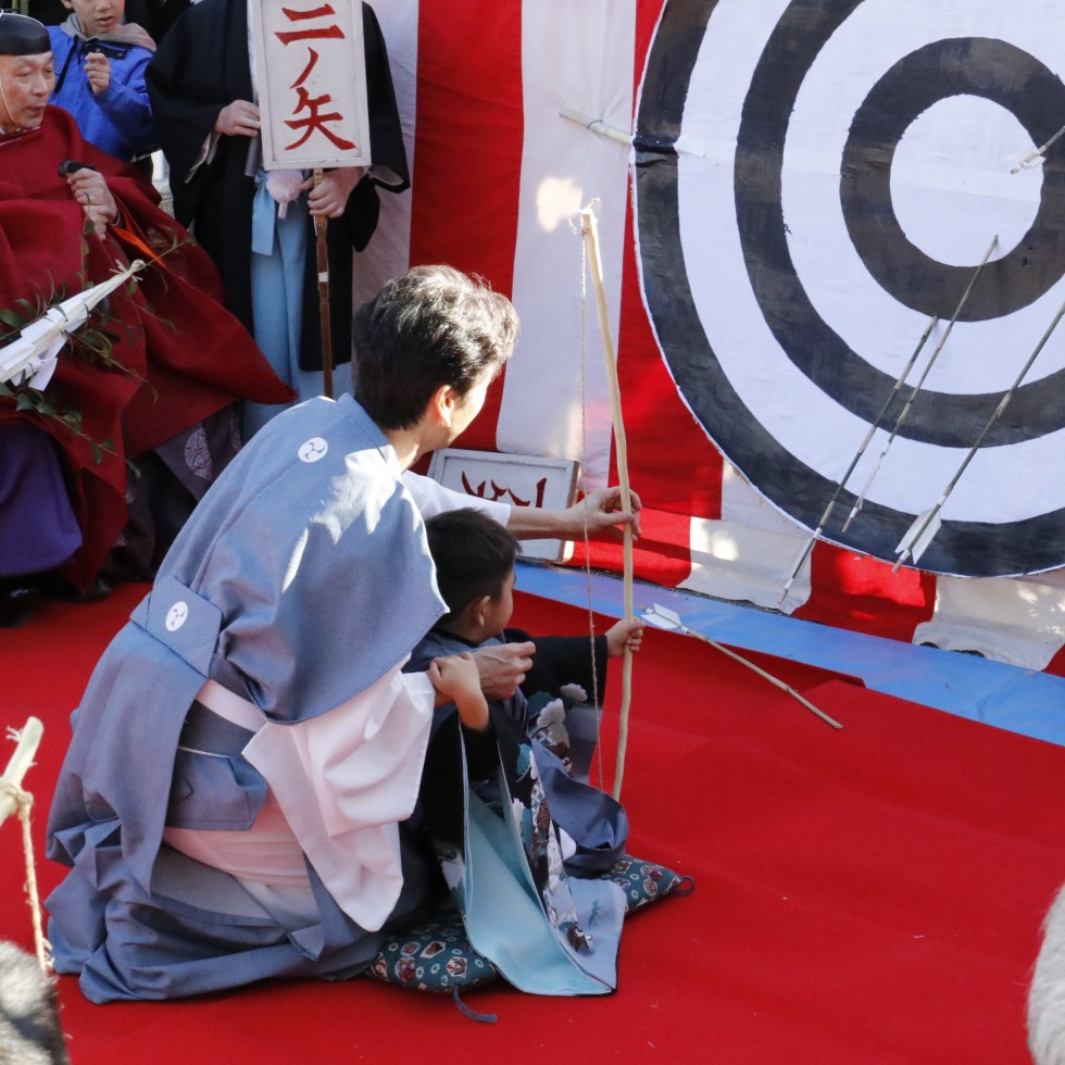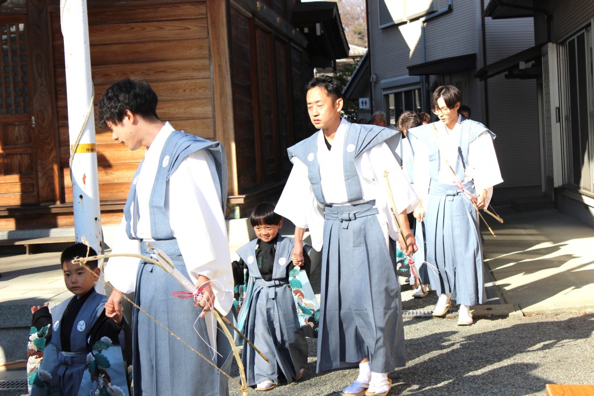 田名地区(旧田名村)11自治会の持ち回りで、射手の条件は八幡宮の氏子で射手の両親が健在で、前年に不幸がなかった家の三歳から五歳までの長男三組が父親に支えてもらい、一ノ矢(天下泰平)、二ノ矢(領土安全)、三ノ矢(五穀豊穣)を三回ずつ射り、四名の射手の放つ矢の的への当たり具合でその年の豊凶を占います。今年の射手親子は、半在家自治会が当番です。