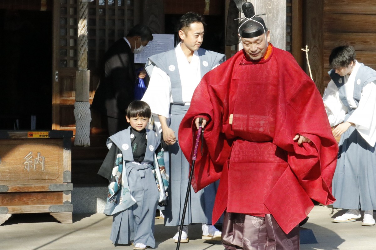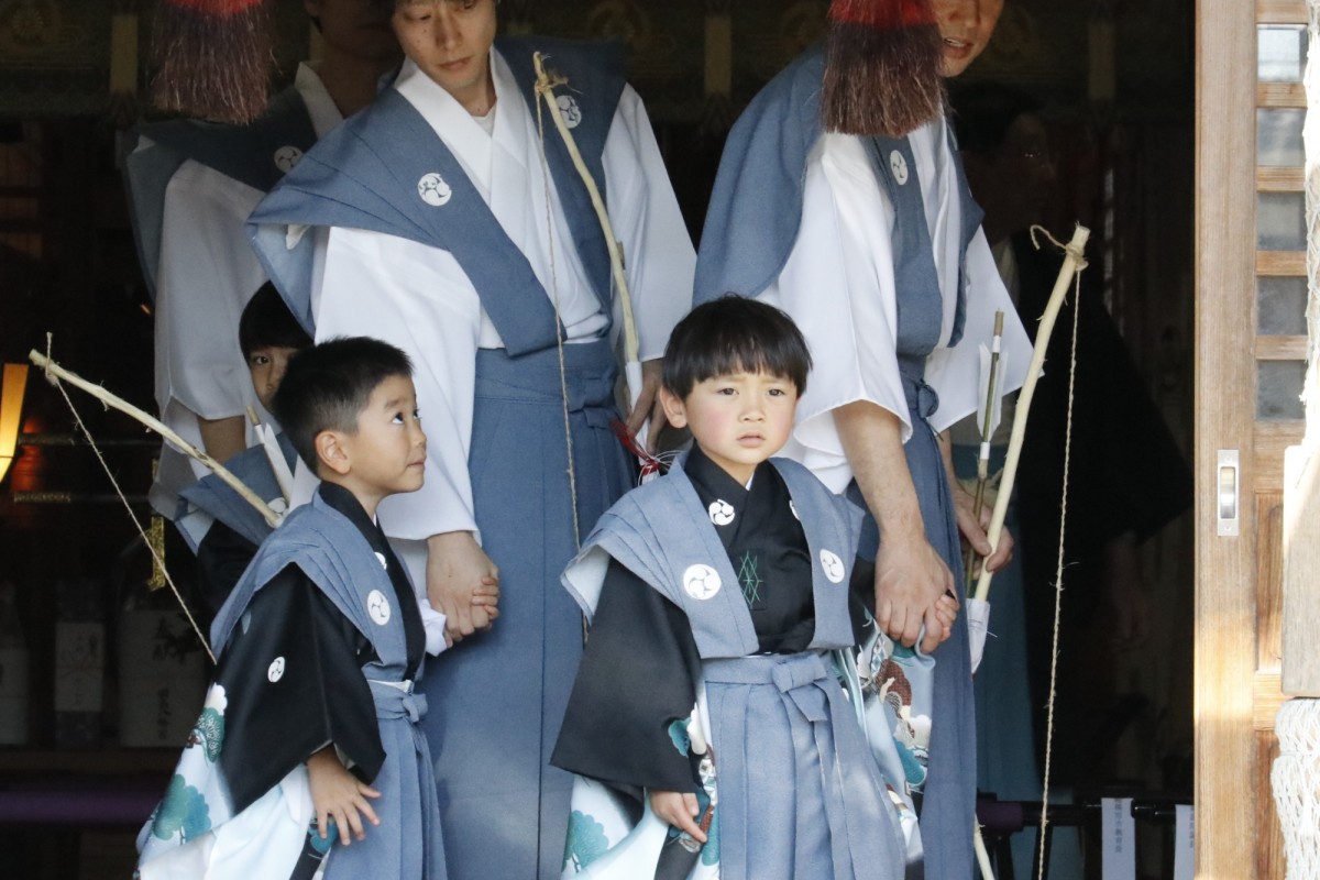 神前において弓矢を授かり宮司を先頭に拝殿から出てきた射手親子。