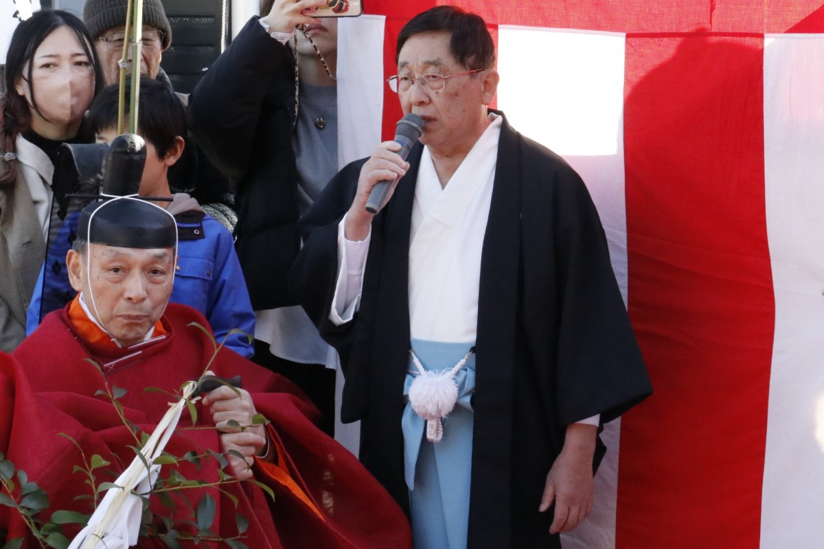 的祭神事が終了した後、挨拶を行う本村相模原市長