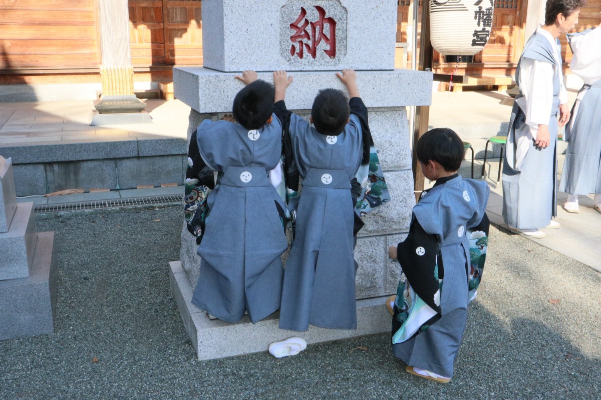 拝殿での神事前に狛犬像の足場で遊ぶ射手の子どもたち。