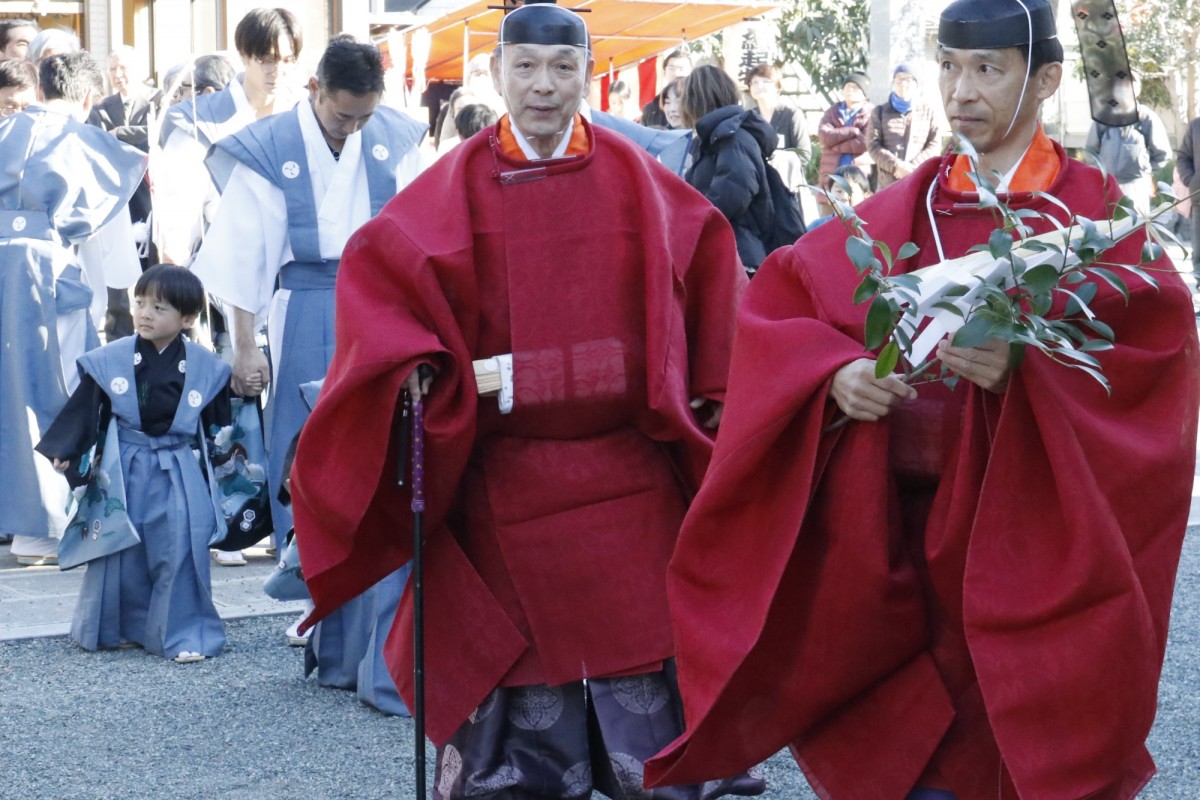 的祭のすべての神事を執り行い、宮司を先頭に的場を出る射手親子ほか役員。