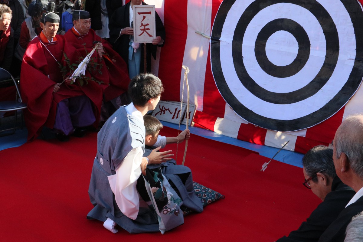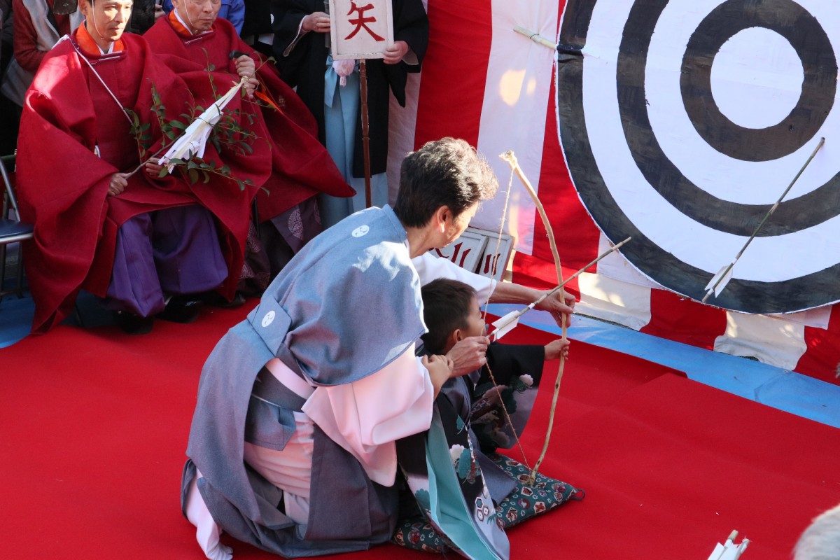 神前において弓矢を宮司から授かり拝殿から出てきた射手親子。